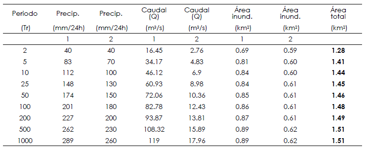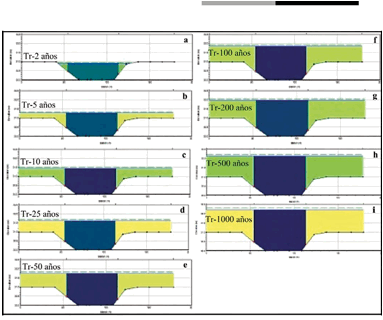 Los resultados del modelaje para los escenarios de inundación fluvial de los periodos de retorno de 2, 5, 25, 50, 100, 200, 500 y 1000 años vistos en