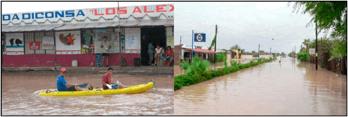De igual manera y siguiendo la metodología del CENAPRED (CENAPRED, 2013; Ramos Radilla, 2006; Salas Salinas, 2011) se emplea para validar el modelaje la información colectada en campo, con habitantes de Ciudad Insurgentes, quienes proporcionaron evidencias fotográficas como las que se muestran en la figura 11 (a) para el huracán Norbert en 2008 y figura 11 (b), para el huracán Jimena en 2009, cuya inundación fue generada por un espejo de agua de 0.25 m y 0.45 m, equivalentes al modelaje para periodos de retorno de 5 y 10 años, respectivamente (figura 10 [b] y [c]). Es posible asumir que el modelaje efectuado brinda una buena aproximación de los posibles escenarios de inundación esperados, según la estimación de los periodos de retorno para lluvias intensas.