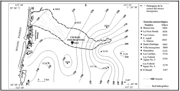 En la figura 3 se muestra la distribución de las estaciones climatológicas ubicadas en la cuenca y periferia del arroyo Insurgentes, así como las isoyetas de precipitación media anual. En esta se observa que los valores con precipitación promedio anual superior a los 190 mm se registran hacia la parte alta de la cuenca, asociados a la zona de bajada de la sierra La Giganta. Ello denota la influencia del gradiente altimétrico de la sierra en la distribución espacial de precipitación, ya que esta se reduce gradualmente conforme se desciende en elevación hacia la franja costera a 120 mm. El área de Ciudad Insurgentes se encuentra en el rango de las isoyetas de 120 a 130 mm de precipitación media anual.