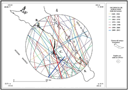 De acuerdo con la revisión de la base de datos de fenómenos hidrometeorológicos, se encontró que en el periodo comprendido desde 1949 hasta 2015, pasaron en un radio de 250 km a partir de la cuenca del arroyo Insurgentes 52 huracanes (figura 4), promediando 0.8 huracanes por año; lo que ubica