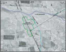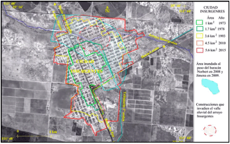En la figura 5 se muestra la situación que Ciudad Insurgentes presentaba en el año de 1973, la cual se asume como respuesta a la demanda de vivienda, por el aumento poblacional desde su fundación en 1953, con un grupo de 80 personas, la cual pasó a 2,473 habitantes en el año de 1970, cuando el poblado apenas cubría una superficie de 1 km2. De la figura 5 hay que resaltar que el poblado se encontraba a 0.3 km al sur del arroyo Insurgentes y limitando al oeste con uno de sus tributarios de primer orden, que se origina en la llanura aluvial con un recorrido en dirección sureste-noroeste de 3.6 km. También hay que destacar que entre los años de 1953 y 1973, en el radio de 250 km a partir de la cuenca del arroyo Insurgentes (figura 4), pasaron 15 huracanes sin que ninguno de ellos ocasionara inundaciones en el poblado.