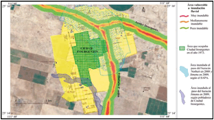 Ante dichos problemas de inundaciones es que la Dirección Municipal de Protección Civil del H. XIV Ayuntamiento de Comondú (2011), en un primer intento de elaboración del Atlas de Riesgos Naturales, presenta un mapa de áreas vulnerables a inundaciones fluviales, el cual se muestra en la figura 7. En esta figura se sobrepone un polígono trazado con información registrada con pobladores de Ciudad Insurgentes; quienes refieren que colonias como La Laguna, aun cuando se encuentra retirada de los arroyos, presentó problemas de inundación durante el huracán Jimena, debido a las modificaciones hechas en el terreno durante la construcción de nuevos asentamientos.