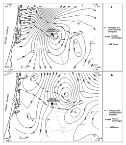 El análisis de precipitaciones se realizó con datos por día para los años comprendidos desde 1940 hasta 2012, de las estaciones meteorológicas que se muestran en la figura 3, cuya información fue proporcionada por la Subdirección de Asistencia Técnica Operativa de la Comisión Nacional del Agua, Baja California Sur. La incidencia de huracanes se obtuvo con la depuración de la base de datos de las estaciones meteorológicas antes referidas, reportadas como lluvias máximas y complementadas con información de la National Oceanic Atmospheric Administration (NOAA, 2016). Con la base de datos de lluvias máximas y empleando el método Gumbel se estimaron las lluvias para periodos de retorno de 2, 5, 10, 25, 50, 100, 200, 500 y 1000 años, corroboradas con los mapas de isoyetas de Ramos Radilla (2006). Los periodos de retorno y el método empleado para la elaboración de mapas de isoyetas fueron seleccionados con la finalidad de que los resultadaos del modelaje fueran compatibles con los de los Atlas de Riesgos Municipales y Estatales, según la metodología del CENAPRED (CENAPRED, 2013; Ramos Radilla, 2006; Salas Salinas, 2011).