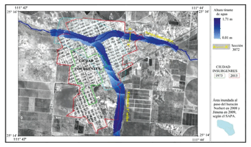 En la figura 9 se muestra la simulación de inundación fluvial para el periodo de retorno de 10 años, y se sobreponen las áreas que ocupaban Ciudad Insurgentes en 1973 y en 2015, así como el polígono que destaca el área que según el H. XIII Ayuntamiento de Comondú (2010) fue afectada por la inundación durante los huracanes Norbert y Jimena. En este escenario de inundación la crecida de corriente en el arroyo Insurgentes y su tributario de primer orden superan por 0.4 m el cauce de los arroyos, generando un área inundable total de 1.44 km2, con un ancho promedio de afectación de 200 m, lo cual representa por lo menos una cuadra de distancia hacia ambos extremos de los cauces de los arroyos. En este contexto las calles en Ciudad Insurgentes, a falta de drenaje pluvial, se incorporan como parte del entorno geomorfológico, formando una intrincada red de drenaje fluvial en donde el agua corre por las calles y las edificaciones actúan como diques, retardando el flujo y la salida de agua hacia la parte baja de la cuenca, inundando así gran parte del poblado.