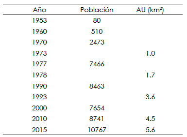 Para el análisis del aumento poblacional se empleó información de los Censos de Población y Vivienda del (INEGI, 2016a), complementada con datos de la Comisión Nacional del Agua (CONAGUA, 2015) y del Gobierno del estado de Baja California Sur (2015). El incremento del área urbana se analizó mediante la sobreposición de las áreas digitalizadas en fotografía aérea de Ciudad Insurgentes para el año de 1973, R-713 de la zona de vuelo 47A línea 3 de INEGI; para los años de 1978 y 1993 se emplearon las cartas topográficas escala 1:50,000, en formato raster de INEGI, G12C37 y G12C47 segunda edición de 1988 y 2000, elaboradas con fotografías aéreas de 1978 y 1993, respectivamente; para digitalizar el área urbana del año 2010 se emplearon las imágenes pancromáticas SPOT 559299 y 559300 y para el año 2015 se emplearon las cartas topográficas G12C37 y G12C47, escala 1:50,000, en formato vectorial de INEGI con actualización al año 2015.