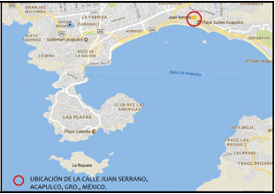 En la figura 1 se muestra la bahía de Acapulco; el círculo rojo indica la ubicación de la zona en estudio. Las figuras 2 y 3 muestran algunos de los efectos y escenarios que se presentan durante las inundaciones ocasionadas por el mar de fondo en las calles referidas con antelación. En la figura 2 (a) puede observarse una inundación de la calle Juan Serrano debido al fenómeno varias veces mencionado; se observan autobuses y un automóvil atrapados, los cuales se encontraban estacionados sobre esta vialidad antes del evento. En la figura 2 (b) se observa otra inundación de la misma calle, donde el mar salió a unos 200 m desde la pleamar; al fondo de la imagen puede verse parte de la bahía de Acapulco. En la figura 3 se muestra una inundación en la Av. Costera Miguel Alemán; en ella pueden observarse dificultades para el tránsito vehicular y peatonal.