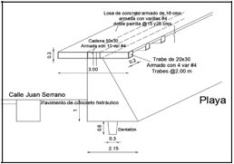 Se propone una terraza que funcionará como mirador y que unirá las banquetas de los hoteles Playa Suites y Emporio; la losa quedará apoyada sobre el muro de contención con un ancho de 3.00 m y de largo 12.55 m, siendo este el mismo ancho de la calle Juan Serrano. La losa estará empotrada a la corona del muro, con el armado a 0.60 m de profundidad; estará soportada por trabes cada 2.00 m y una cadena principal del mismo ancho de la corona del muro (figura 8).
