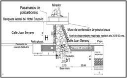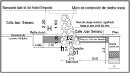 El diseño final consiste en un muro de piedra braza sobre el cual descansará un cantiliver de 3.00 m, que trabajará como terraza (figura 11). El muro de contención detendrá el paso del oleaje provocado por el mar de fondo. Para el desagüe de las aguas pluviales que se concentran en la calle Juan Serrano se propone una rejilla pluvial junto al muro, que conducirá el agua por gravedad a un pozo de absorción que se ubicará bajo la arena de la playa (figuras 9 y 10).
