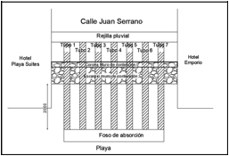 La distancia de los tubos al foso de absorción que se ubicará en la playa tendrá una separación de 20.00 m, a partir de donde termina la cimentación del muro de contención (figuras 9 y 10).