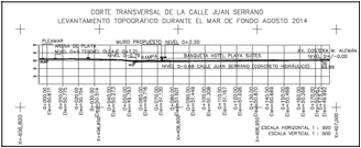 Se llevó a cabo un análisis cualitativo de la problemática y topografía del sitio, se observó que las aceras de los hoteles Playa Suites y Emporio tienen una cota más elevada a la calle Juan Serrano. Se consultó el historial de eventos y se llevó a cabo un levantamiento topográfico, antes y después de presentarse el fenómeno, con el fin de observar la diferencia en las cotas de los niveles de arena. Uno de los perfiles topográficos puede verse en la figura 4.