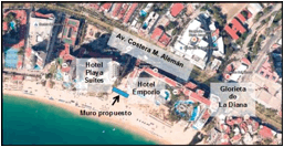 Con base en la información recabada y en los tipos y funciones de estructuras de protección costera (Salles Afonso de Almeida & Silva Cazarín, 2004), se plantea como propuesta de solución un muro de mampostería de piedra con dentellón, que se ubicará en el punto más alto de las banquetas de los hoteles Emporio y Playa Suites, atravesando la calle Juan Serrano, para impedir el paso del agua del mar hacia la calle (figuras 5 y 6).