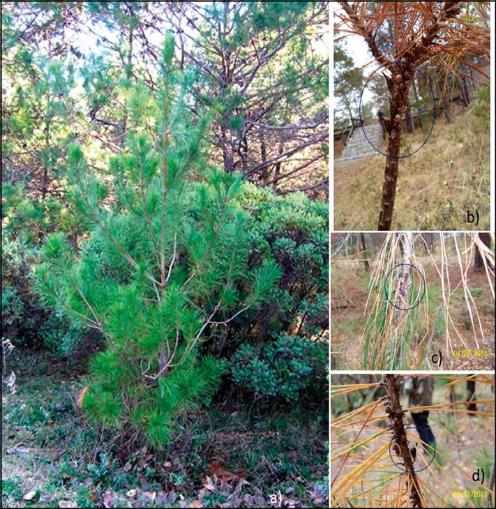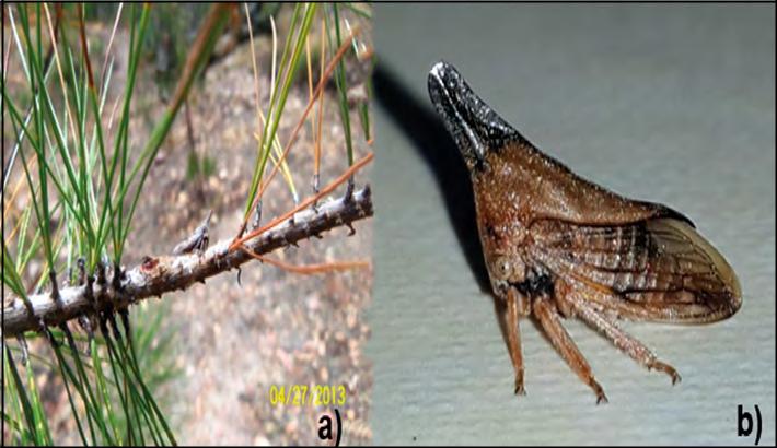 Como parte del proyecto “Diagnóstico fitosanitario en comunidades forestales del estado de Aguascalientes” se desarrollaron recorridos en los diferentes ecosistemas del estado. En abril de 2013 se realizaron visitas de diagnóstico en la Sierra Fría en comunidades naturales dominadas por poblaciones de Pinus teocote Schltdl. & Cham., P. leiophylla Schltdl. & Cham., P. durangensis Ehren., Quercuspotosina Trel., Q. eduardii Trel., Q. sideroxyla Humb. & Bompl. y asociaciones de ellas. En una visita realizada al predio forestal “Peña Parada”, ubicado en las coordenadas UTM 747392 este y 2451219 norte, con una altitud promedio de 2535 m.s.n.m., se revisó un área reforestada con plantas de P. greggii var. greggii de dos años de edad (D. Domínguez, comunicación personal), se observaron signos de defoliación y mortalidad de la parte aérea del arbolado. Una revisión de cada espécimen mostró exudaciones sobre el fuste, posiblemente producto de la aparición de insectos con aparato bucal chupador. En el mismo predio se revisaron cinco sitios reforestados con la misma especie de conífera. En el primero,c 80% de los árboles mostraron signos y síntomas de daño por insectos y en 60% de los casos se encontraron insectos en fase de ninfa, adultos e inmaduros (figura 1). En el segundo sitio se encontró daño por infestación en 30 % de los árboles, en el tercer sitio 40%, en el cuarto sitio 20% y 30% en el quinto sitio.