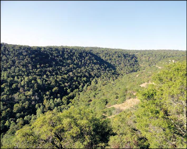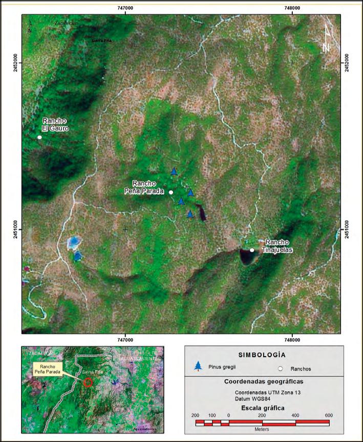 P. greggii se realizaron recorridos de observación y análisis de los sitios con reforestación en cinco predios de la Sierra Fría: (a) Barranca Piletas, (b) Barranca de Juan Francisco, (c) Predio el Búfalo, y Rancho San Francisco (figura 2).