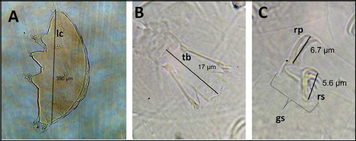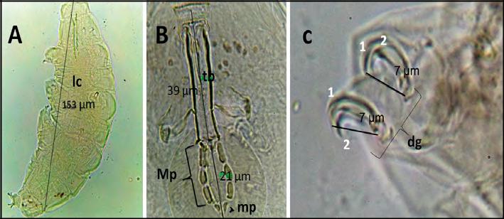 Género: Milnesium (Milnesiidae) Doyère 1840 (figura 3A). Tardígrados con un par de papilas cefálicas y seis papilas peribucales. Garras del tipo Milnesiidae (la ramificación primaria y secundaria completamente separadas) (figura 3C). Aparato bucal-faríngeo del modelo Milnesium (figura 3B), con un amplio tubo bucal en las especies conocidas. Bulbo faríngeo elongado sin apófisis y placoides ausentes. Largas láminas peribucales.