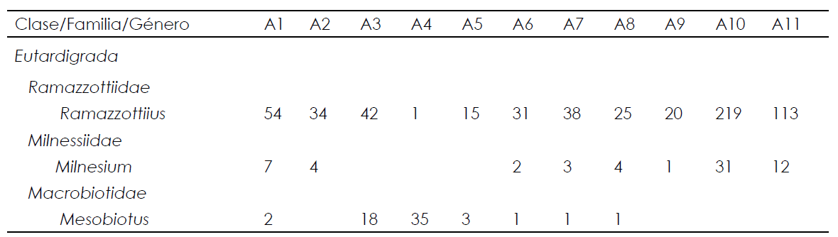 El liquen, musgo, y la hojarasca, son los ecosistemas preferidos en ambientes naturales por los géneros registrados (Kaczmarek et al., 2014). En ambientes modificados (urbanos y rurales) los tardígrados generalmente optan por habitar liquen y musgo, lo que relaciona su diversidad con la salud ambiental de estos sitios (Glime, 2013; González-Reyes et al., 2016); por lo que algunas especies han sido catalogadas como indicadoras de calidad ambiental (Macrobiotushufelandi, Schultze, 1834), o detectoras de ambientes urbanos, es el caso de Milnesium (González-Reyes et al., 2016). En el presente trabajo los tardígrados se encontraron asociados a liquen en árboles de cítricos en una plantación de traspatio en la comunidad de El Palmar. Milnesium fue registrado durante el estudio. Sin embargo, sus abundancias fueron relativamente bajas respecto a Ramazzottius, un género que en estudios anteriores ha mostrado altas abundancias en este mismo ambiente, frente a otras especies de tardígrados y otros micrometazoarios (Šatkauskienė, 2012).