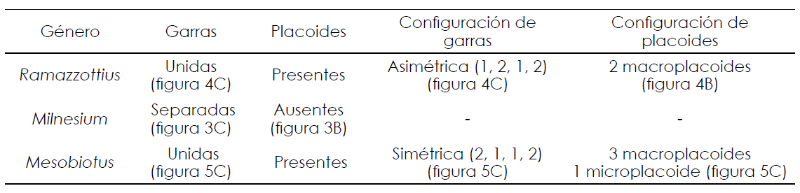 Macrobiotoideos con diplogarras de tipo-“Y” con arreglo simétrico (ramificaciones: secundaria, primaria, primaria, secundaria) del modelo Mesobiotus (figura 5C), con un tracto común caracterizado por un septo interno que define una parte distal. Cutícula sin poros. Aparato bucal-faríngeo con un anillo bucal que contiene 10 láminas peribucales. Tubo bucal rígido, tres macroplacoides redondeados dispuestos a lo largo de una línea curva y un microplaciode. La distancia entre el microplacoide y el tercer macroplacoide es reducida (el espacio entre estas es menor que la longitud del microplacoide) (figura 5B). Huevos puestos libremente, caracterizado por procesos cónicos o hemisféricos, generalmente con puntas.