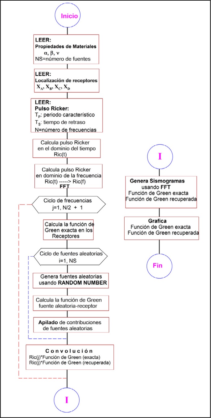 7 y 8) validaciones de las fórmulas propuestas en este trabajo y sus contrapartes teóricas. Demostrando la validez de la formulación de este trabajo y su buena precisión. Es de destacar que para el cálculo de las funciones de Green recuperadas fue necesario desarrollar un programa de cómputo en lenguaje de programación FORTRAN empleando el diagrama de flujo mostrado en la figura 1.