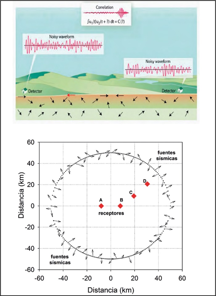 Es de resaltar que el ruido puede ser generado de forma natural por el paso de vehículos, uso de maquinaria o cualquier otra forma de generación de movimientos. Los desplazamientos resultantes medidos en dos puntos (receptores) pueden ser sometidos a un procedimiento de correlación (aplicando la ecuación 8 y la figura 1) y obtener una de las principales propiedades del medio, que es la función de Green. Esta función significa la respuesta del medio ante cargas o impulsos dinámicos.
