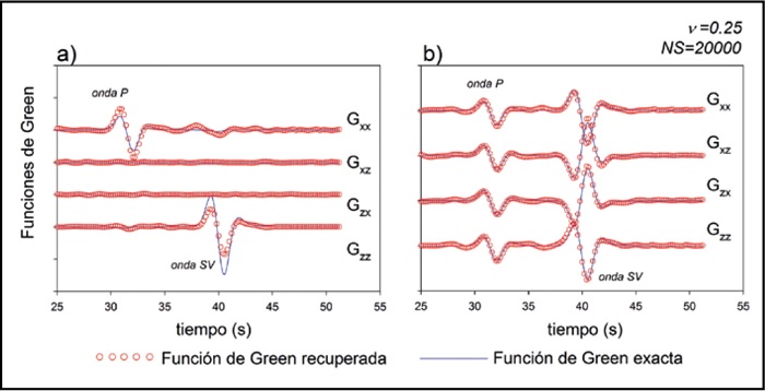 Mediante receptores mostrados en la figura anterior y haciendo uso de la ecuación (8), en la figura 3, se muestra la recuperación de la función de Green correlacionando ruido sísmico (círculos) y las funciones de Green exactas (línea continua) obtenidas mediante la aplicación de las funciones de Green exactas, las cuales se muestran en las ecuaciones (11) a (13). Se hace el uso de Gxx, Gxz, Gzx y Gzz a manera de identificar las componentes del tensor de Green. Se utiliza una relación de Poisson para la caracterización del medio y una aplicación de 20,000 fuentes aleatorias. En la siguiente figura es posible observar que la ecuación (8) tiene una correcta aplicación y que se obtiene la recuperación de la función de Green con buena aproximación
