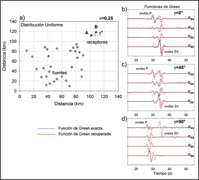 En la figura 4, para una distribución no isotrópica de fuentes, se expone la recuperación de la función de Green. Esta distribución, llamada Uniforme, se ha tomado de Liu y Zhang (2001) (figura 4a). Para esta distribución es posible apreciar que es determinante la orientación de las fuentes o receptores en la recuperación de la función de Green. Para y