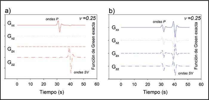 En la figura 6a se muestra la función de Green entre los puntos A y B, mientras que para los puntos C y D se tiene la figura 6b. Se observa también el claro arribo de las ondas P y SV ilustrando también la diferencia en magnitud de las ondas P con respecto a las ondas SV.