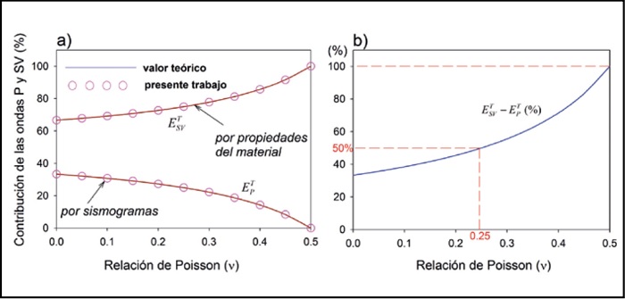 En la naturaleza es bien sabido que la energía se propaga mediante ondas. Particularmente, los eventos sísmicos y la propagación de ondas sísmicas conllevan una cantidad enorme de energía, la cual puede ocasionar severos daños a las ciudades. En la ingeniería civil-estructural, geofísica, y sismología, es bien conocido que las ondas de contante (SV) poseen más energía y arriban al sitio después de las ondas primarias (P). El contenido de energía de las ondas SV es mayor con respecto a las P y este contenido de energía depende básicamente de las características del medio donde se propagan las ondas sísmicas (velocidades de propagación, den-sidad, relación de Poisson, entre otras). Una relación de Poisson alta implica que se está en presencia de un sólido incompresible y que de acuerdo con lo mostrado en la figura 7 la mayor parte de la energía es conducida por las ondas SV, llegando al caso de que para relaciones de Poisson de 0.5, las ondas SV conducen 100% de la energía total.