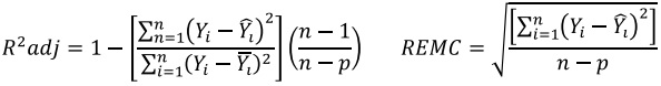 La calificación de la bondad de ajuste de los modelos se realizó utilizando los estadísticos coeficiente de determinación ajustado (R2adj) y raíz del cuadrado medio del error (REMC):