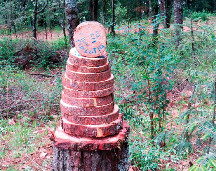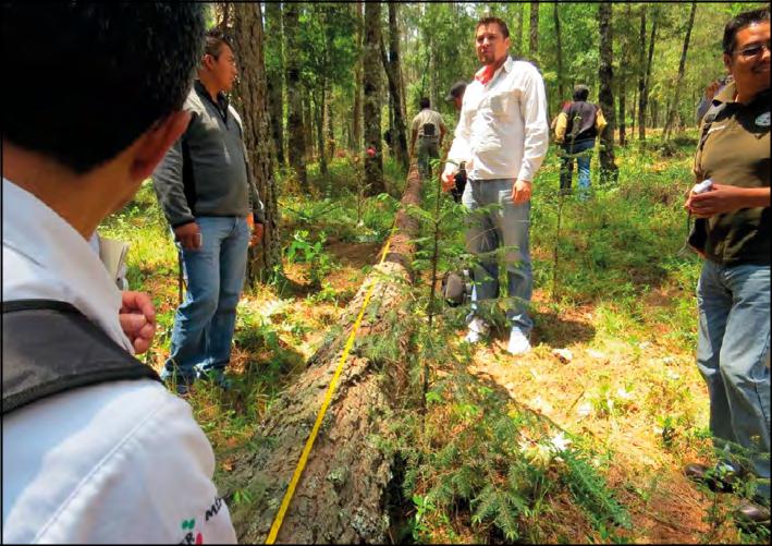 Para el presente estudio se seleccionaron 111 árboles de Pinus arizonica, 108 de P. durangensis y 91 de P. engelmannii considerando su conformación morfológica y estado de salud. La muestra representó a todas las categorías diamétricas presentes en el área de estudio. Los árboles seleccionados fueron identificados por especie para ser derribados, desramados y seccionados en trozas de diferentes dimensiones (figuras 2 y 3). De cada árbol se midió y registro la siguiente información: diámetro y altura del tocón, diámetro a 0.30 m y 0.60 m después de la altura del tocón, así como diámetro a una altura de 1.30 m a partir del suelo. Posteriormente se registraron los diámetros a cada 2.60 m hasta llegar a la parte de la punta del árbol.