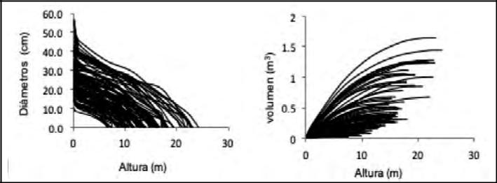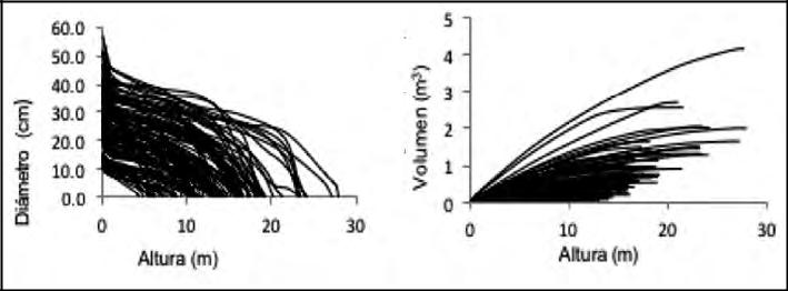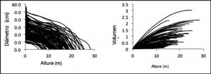 Para corroborar que la tendencia de los datos sea la que presenta el ahusamiento del fuste de los árboles y detectar valores atípicos en la base de datos que se utilizó, se graficaron los diámetros y los volúmenes acumulados contra las alturas del fuste. En las figuras 4, 5, y 6 se observa la inexistencia de datos atípicos y la tendencia del perfil del fuste y el volumen de los árboles en relación con la altura de cada una de las especies estudiadas.
