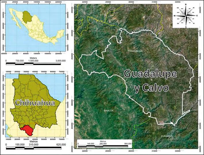 El presente estudio se llevó a cabo dentro del municipio de Guadalupe y Calvo, el cual se encuentra ubicado en la parte sur del estado de Chihuahua dentro de la Sierra Madre Occidental, específicamente en la zona denominada Sierra Tarahumara. Este municipio limita al noroeste con los municipios de Morelos y Balleza, al norte con el municipio de Guachochi. Al sur y al sureste colinda con el estado de Durango, en particular con los municipios de Guanacevi, Tepehuanes y Tamazula. Al suroeste con el municipio de Badiraguato del estado de Sinaloa (figura 1). El municipio comprende ocho comunidades, 26 ejidos y 126 predios particulares que se encuentran bajo manejo forestal, cubriendo una superficie total de 904,780 ha. Los principales climas que caracterizan a la región pertenecen a los grupos Cw, Acw y Bs que corresponden a los templados subhúmedos, semicálidos y semisecos, respectivamente. Las precipitaciones promedio en la región del bosque templado varían de 500 a 1050 mm, mientras que las temperaturas medias van de los 16 a los 20 °C. La mínima y máxima extrema en la región es de -15 y 37 °C.