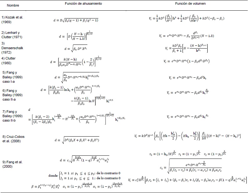 El sistema compatible de ahusamiento y volumen desarrollado por Fang et al. (2000), por su flexibilidad de adaptación a las diversas formas del fuste de los árboles, tiene un ajuste significativo a la base de datos (Diéguez-Aranda, Castedo-Dorado, Álvarez-González, & Rojo, 2006).