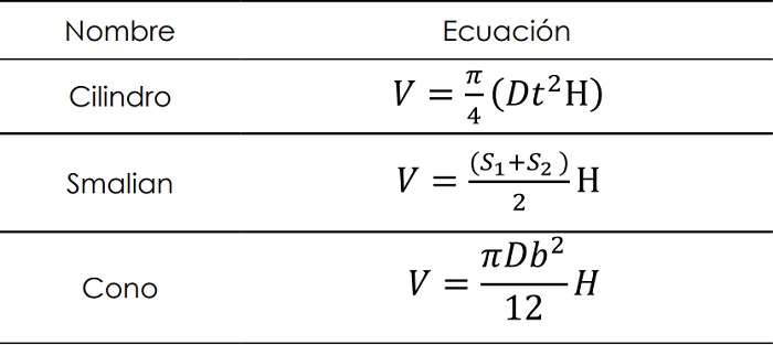 Con la información de campo, se estimó en cada árbol el volumen del tocón, trozas del fuste y troza de la punta utilizando las fórmulas de cilindro, Smalian y del cono, respectivamente (tabla 1).