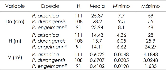 En la tabla 3 se presentan los estimadores descriptivos número de árboles, valor promedio y valores mínimo y máximo de las variables diámetro normal, altura total y volumen fustal de Pinus arizonica, P. durangensis, y P. engelmannii.