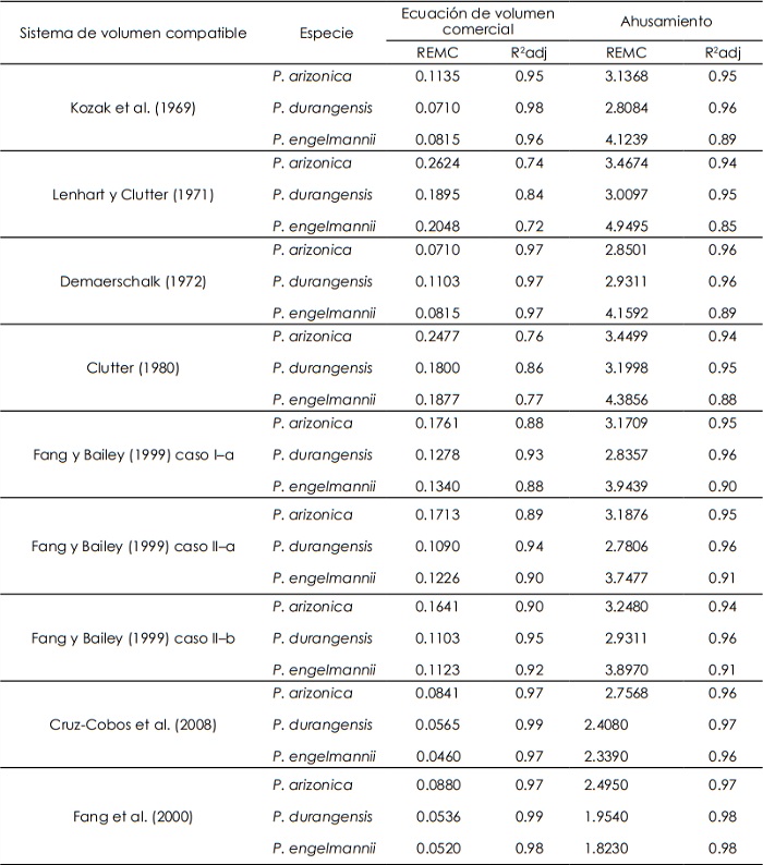 Aunque el modelo compatible de volumen comercial-ahusamiento de Fang et al. (2000) presentó los mejores resultados para Pinus arizonica, P. durangensis y P. engelmannii, el sistema de volumen ahusamiento descrito por Cruz-Cobos et al. (2008) es recomendable por su simplicidad.
