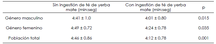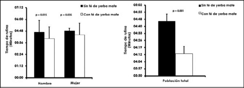 En cuanto al rendimiento deportivo con base en el tiempo cronometrado de acuerdo al género después de consumir el té de yerba mate se encontró que las mujeres obtuvieron menor tiempo en comparación con el género masculino de 23 segundos de diferencia (4:24 vs. 4:01 min) p= 0.385; no obstante, no representa diferencias estadísticas entre géneros; sin embargo, cabe mencionar que esta mejora en el tiempo de ejecución de rutina es notoria al momento de estratificar por género, como muestran la tabla 2 y la figura 2.