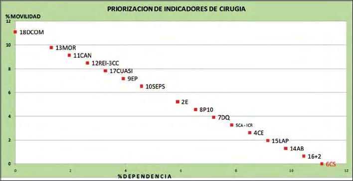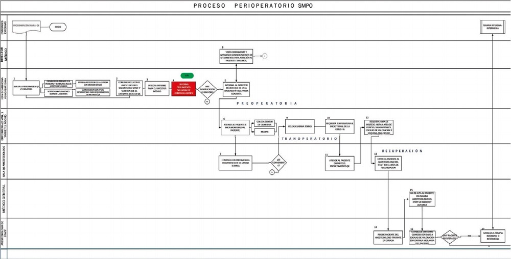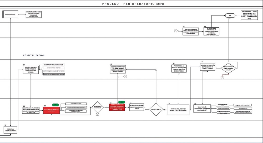 Se presenta a continuación el proceso de atención quirúrgica y del servicio de medicina perioperatoria (SMPO), se trabajan de manera simultánea y complementaria; este segundo proceso en periferia a cirugía para garantizar la calidad de atención al paciente desde el preoperatorio hasta su alta de hospitalización en hospitales privados y públicos con grandes retos de innovación médica. El resultado del análisis de priorización es de 18 indicadores1 para mandos medios.