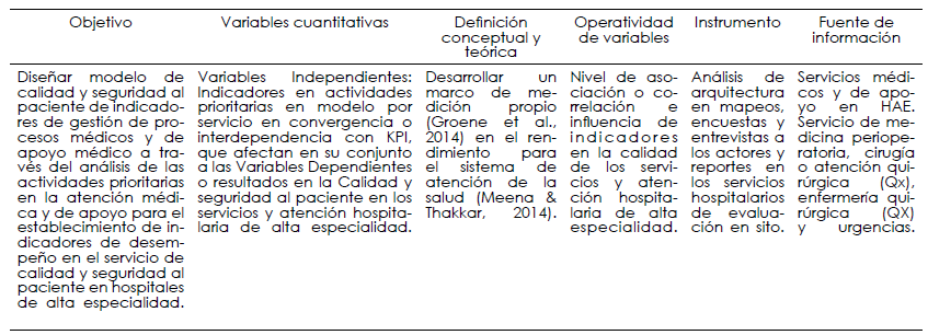Se tienen variables independientes (supuesto o causa a manipular) Entradas. Son los indicadores establecidos en su conjunto, 18 indicadores médicos (Gironés Muriel et al., 2013) para el proceso de cirugía y perioperatorio, que afectan los resultados de calidad en el servicio médico que fueron utilizados para apoyar el análisis con procesos de medición cuantitativa. Y variables dependientes (observado) Salida o resultado (influye y/o mejora). La calidad y seguridad al paciente y seguridad en el servicio y atención hospitalaria de alta especialidad (tabla 1).