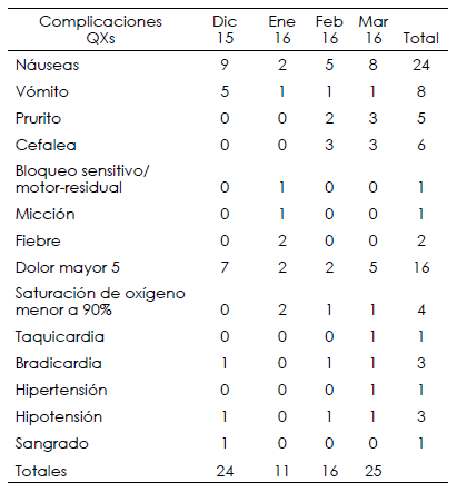 del proceso perioperatorio y de atención quirúr-gica; el algoritmo es: % Complicaciones= Número de alteraciones fisiológicas detectadas y resueltas/ Número de pacientes vigilados por el servicio X 100. El % en complicaciones se obtuvo del análisis mensual del proceso SMPO como se puede ver en la tabla 2 de complicaciones quirúrgicas. El análisis permite contar con información que ayuda a los médicos a encontrar la causa raíz de porque se complica la intervención quirúrgica; por ejemplo si hay muchos pacientes con náuseas posiblemente se tendrá que revisar el medicamento que está causando un
