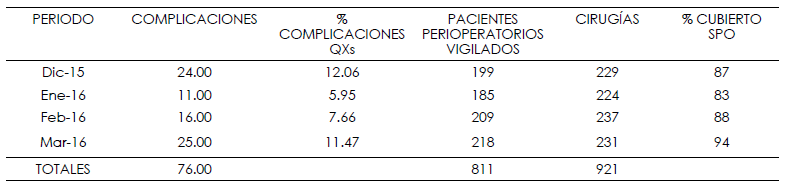 El indicador de la cobertura atendida del (SMPO) se integra como indicador para calcular las complicaciones en función de su cobertura de atención y servicio. Previamente identificada la actividad en el mapa del proceso (SMPO) y de atención quirúrgica, el algoritmos es: % Cobertura atendida en el SMPO vigilados en el (SMPO)/Cirugías Totales X 100. Dicho indicador muestra cual es la totalidad de pacientes quirúrgicos en el cual se da continuidad en este servicio y refleja la garantía de dar seguimiento a pacientes desde que ingresan a cirugía hasta que son dados de alta. La perspectiva de estos dos indicadores de complicaciones quirúrgicas y de cobertura en el SMPO afecta la calidad y seguridad ofrecida al paciente. El resultado del uso y categorización en el control se muestra en la tabla 3.