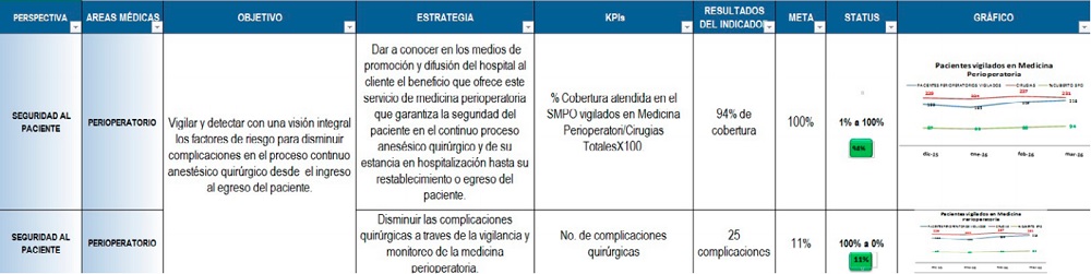 Este indicador de complicaciones quirúrgicas y de cobertura en el (SMPO) es dos KPI afectan la calidad y seguridad al paciente. En la primera categoría abarca la satisfacción al cliente o usuario en los bienes o servicios que recibe, y en la segunda se monitorean el uso de buenas prácticas preventivas para disminución de complicaciones quirúrgicas, que son causas de eventos adversos; en el otorgamiento de atención al paciente.