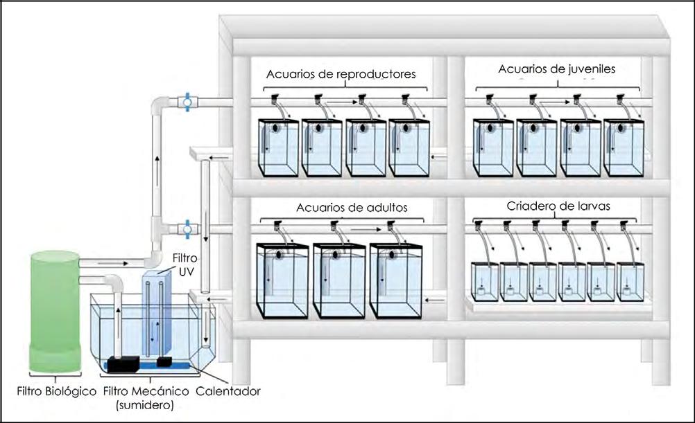 El sistema se construyó con materiales locales de bajo costo y consiste en dos niveles con acuarios de vidrio de 15, 10, y 1.5 l (figura 1). Los acuarios descargan sobre una canaleta de PVC a través de un tubo recubierto por un extremo con malla de nylon, el cual desemboca en un depósito de acrílico (sumidero). Los primeros compartimentos permiten separar por decantación los sólidos del agua, el líquido pasa a un tercer depósito en donde una bomba de impulsión de 150 l/h bombea el flujo hacia la lámpara UV, el flujo es bombeado por una segunda bomba de impulsión de 350 l/h hacia un filtro biológico —consistente en un tubo hermético de PVC de 50 cm de diámetro que en su interior contiene 1/2 k de esferas de poliestireno, estas esferas sirven como superficie para adhesión de bacterias benéficas que promueven la nitrificación y desnitrificación del agua—, finalmente, el agua regresa a través de un sistema de tuberías de PVC hacia ambos niveles, en donde válvulas de PVC grado alimenticio controlan el flujo que alimenta los acuarios. En el interior del depósito sumidero se colocó un calentador de alto rendimiento de 300 W, el cual mantiene la temperatura del sistema a 28.5 ºC.