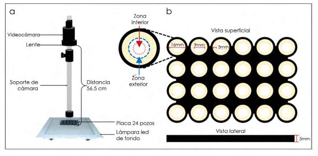 Finalizada la exposición se corroboró la ausencia de malformaciones y las larvas de 7 dpf fueron transferidas al cuarto de grabación previamente climatizado a 28 ± 1.5 °C. Un total de 24 larvas fueron colocadas sobre placas de 24 pocillos (Costar, # 3526, Corning, NY, US) adaptadas para grabación previamente llenadas con medio E2 sin tóxicos. Para la grabación se utilizó una videocámara Flea3 (Point Grey Research) acoplada a un lente computar M6Z1212-3S sobre un soporte para cámara. Como fuente de iluminación se utilizó un luminario tipo led de 6500 K (General Lighting 04745-1) (figura 2a). La adaptación de las placas se realizó rebajando su altura hasta 5 mm, con ayuda de una herramienta rotativa de velocidad variable y su accesorio de corte #426 (Dremel 3000, D. F., México); posteriormente fueron pintadas en la parte exterior de los pocillos con pintura acrílica negra para producir un efecto de máscara durante la grabación. Se agregó un molde interno de agar bacteriológico a 1% llenando los pocillos con aproximadamente 1.5 ml de agar (figura 2b). El montaje de videograbación se colocó dentro de una estructura de madera para evitar estímulos externos.