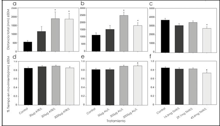 Los resultados muestran un desarrollo normal de los organismos sin malformaciones visibles (figura 3). Adicionalmente, no se observó una mortalidad con los tratamientos al finalizar la exposición mayor a 10% (datos no mostrados). En experimentos independientes la exposición durante 7 días a ATR, Asi y TMX generó alteraciones significativas en la actividad locomotora en larvas de pez cebra. Las concentraciones de 0.3 y 3 mg ATR/L fueron suficientes para producir hiperactividad [F (3, 37)= 4.75, p= 0.0065] (figura 4a). De la misma forma, las larvas ex-puestas al Asi desarrollaron un aumento significativo en la actividad motora después de 7 días de exposición a las dosis de 0.5 y 5 mg Asi/L [F (3, 79)= 6.69, p= 0.0004] (figura 4b). Un efecto de hipoactividad se observó en los individuos expuestos al insecticida TMX en donde una dosis de 29.1 mg TMX/L redujo la distancia total recorrida [F (3, 116)= 3.51, p= 0.0044] (figura 4c).