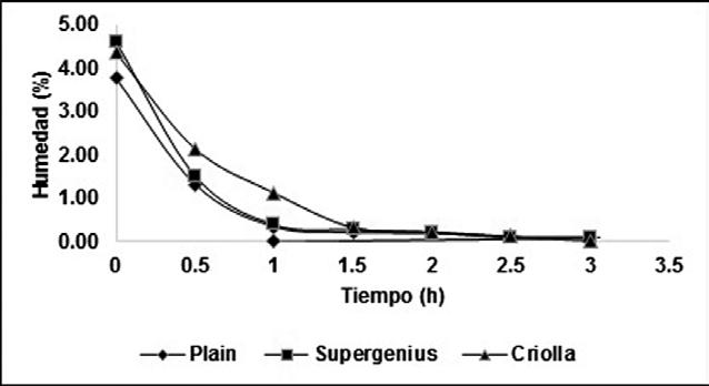 Al someter las semillas al proceso de secado durante 2 h a 55 °C se obtiene una humedad promedio de 4.82% ± 0.03. Para la realización de la curva de secado se obtiene una masa de semilla seca de 14.49 g, la cual se emplea para el cálculo de humedad en función del tiempo. La curva de secado de la variedad en cuestión (Plain) se compara con las curvas paras las variedades cubanas Criolla y Supergenius con el objetivo de conocer el porcentaje de humedad previo al proceso de extracción (figura 1).