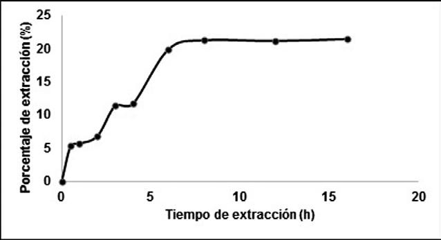 Al ser desconocida la cinética del proceso de extracción para la variedad Moringa oleifera Plain de origen cubano, se analiza el comportamiento del porcentaje de extracción de aceite para la relación soluto-solvente 1:6 a diferentes tiempos. El estudio cinético se realiza con la finalidad de realizar las extracciones a un tiempo constante y, de esta manera, fijar este parámetro para todas las extracciones. En la figura 2 se muestra la curva obtenida.