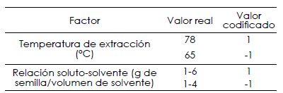 Para el diseño de experimentos se trabaja con el programa estadístico Statgraphics Centurion versión XV. Se propone un diseño factorial 22, considerando dos factores a dos niveles: los factores considerados son la temperatura de extracción y la relación soluto-solvente, los niveles de estudio para el factor temperatura de extracción son 78 y 65 °C, y para la relación soluto-solvente, 1:4 y 1:6. Estas son relaciones masa-volumen; es decir, masa de semilla entre volumen de solvente. En todos los casos, la variable dependiente es el porcentaje de extracción de aceite. Para todos los experimentos se hacen dos réplicas para un total de 12 experimentos. En la tabla 1 se muestran los valores reales y codificados de cada factor en estudio.