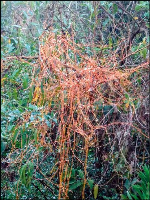 Un ejemplo de ello es Cuscuta jalapensis Schltdl., planta perteneciente a la familia Convolvulaceae, cuya distribución es cosmopolita. Algunas de estas plantas son arbóreas y otras arbustivas, con flores que descuellan por su aspecto infundibuliforme. La mayoría de las convolvuláceas se encuentran en hábitats soleados y abiertos, mientras que muy pocas sobreviven en bosques muy sombreados. El género Cuscuta se caracteriza porque posee tallos anaranjados y/o amarillos, además de que son plantas parásitas (Oxelman, Kornhall, Olmstead, & Bremer, 2005; Rzedowski Rotter & Calderón de Rzedowski, 2005). Se ha determinado que las cuscutas tienen cualidades diuréticas y laxantes; también se han empleado para controlar la tos, afecciones bronquiales y problemas de vías respiratorias; la decocción se utiliza como cicatrizante y en el tratamiento de afecciones hepáticas (Buck, 1969; Múlgura, 1969).