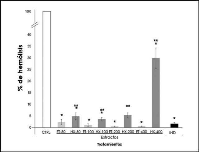 Al analizar los resultados obtenidos, en relación con el porcentaje de hemólisis inducida con solución salina hipotónica, el ANOVA mostró diferencias estadísticamente significativas entre los grupos [F (9,20)= 379.986; p < 0.001]. La prueba post-hoc indicó que las distintas concentraciones de los extractos y la indometacina disminuyeron (*p < 0.001) el porcentaje de hemólisis con respecto al grupo control (CTRL), el cual fue considerado como 100% de hemólisis. Se determinó que la menor hemólisis se presentó en el extracto etanólico (ET) y la indometacina (IND) con valores por debajo de 5%; por otra parte, en el extracto hexánico (HX) la hemólisis fue mayor a 5% a concentraciones de 50, 100, 200 μg/ml y de 32% en la concentración de 400 μg/ml. Todos los valores del porcentaje de hemólisis obtenidos con el extracto hexánico fueron mayores al control farmacológico indometacina (**p < 0.001). Esto se encuentra en la figura 2.