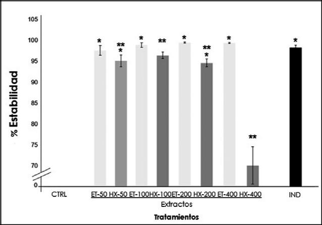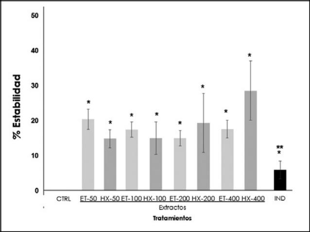 Al analizar el porcentaje de estabilidad de la membrana se encontraron diferencias estadísticamente significativas entre los grupos [F (9,20)= 379.975; p < 0.001], la post-hoc indicó que en ambos extractos las concentraciones probadas aumentaron el porcentaje de estabilidad en comparación con el grupo control, en el que se obtuvo 0% de estabilidad (*p < 0.001).