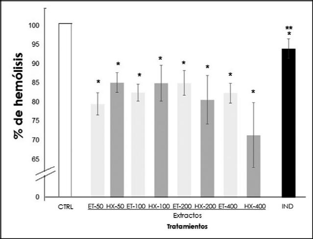 Por el contrario, en el extracto hexánico se encontró un efecto antiinflamatorio menor, puesto que hubo mayor hemólisis, lo que tuvo como consecuencia una baja estabilidad de la membrana en relación con el extracto etanólico y con la indometacina. En contraste, en la hemólisis inducida con calor los resultados mostraron que ambos extractos disminuyeron de manera similar la hemólisis, con una mayor estabilización de la membrana eritrocitaria con un efecto antiinflamatorio mejor al de la indometacina para esta prueba.